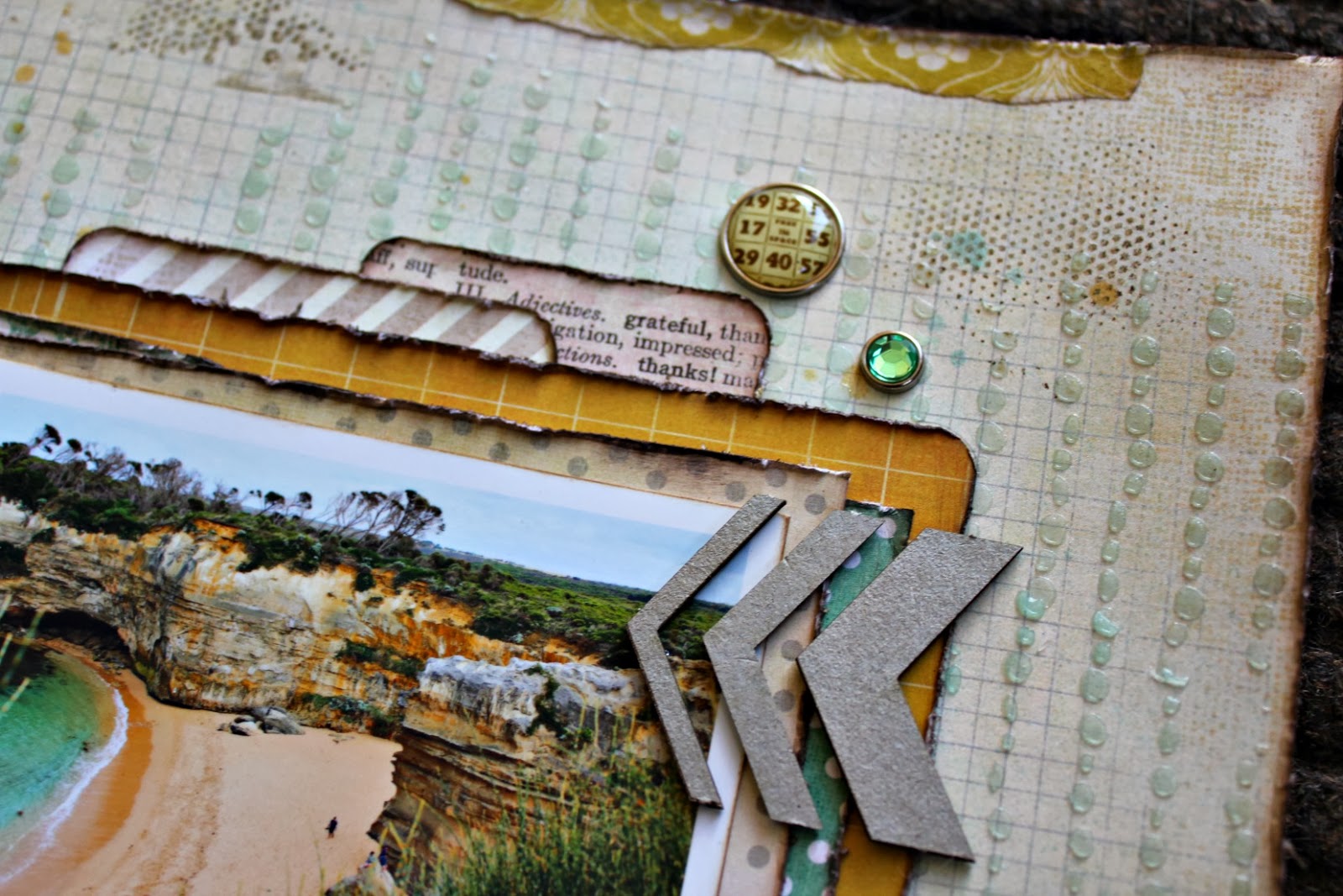 I LOVE these 2Crafty Chevron bits & can't get enough of them lately - so expect to see them on lots of layouts in the future :). I've added some texture paste to again get some texture happening, and then coloured the chevrons by painting them with Dylusions ink spray.