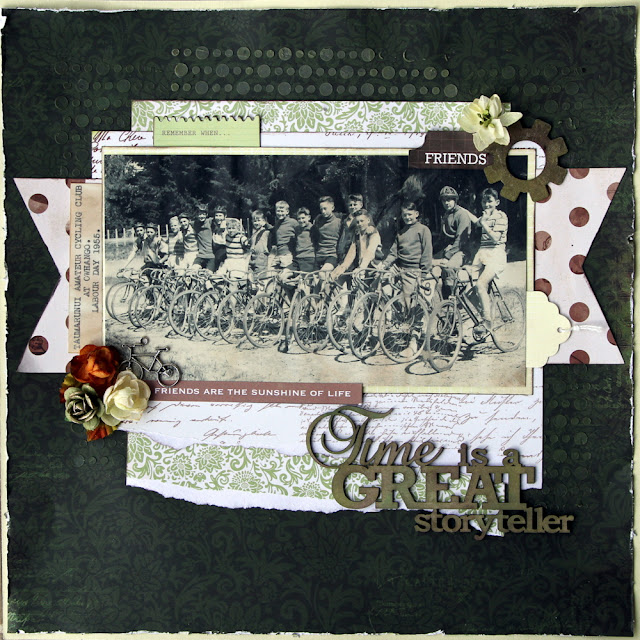 My photograph is a copy of one of my Dads original photos from 1955. The black and white photo with it's greenish tinge went perfectly together with the neutrals in the Botanica collection. The friendship embellishments were the right touch for this group photo of his cycling club.